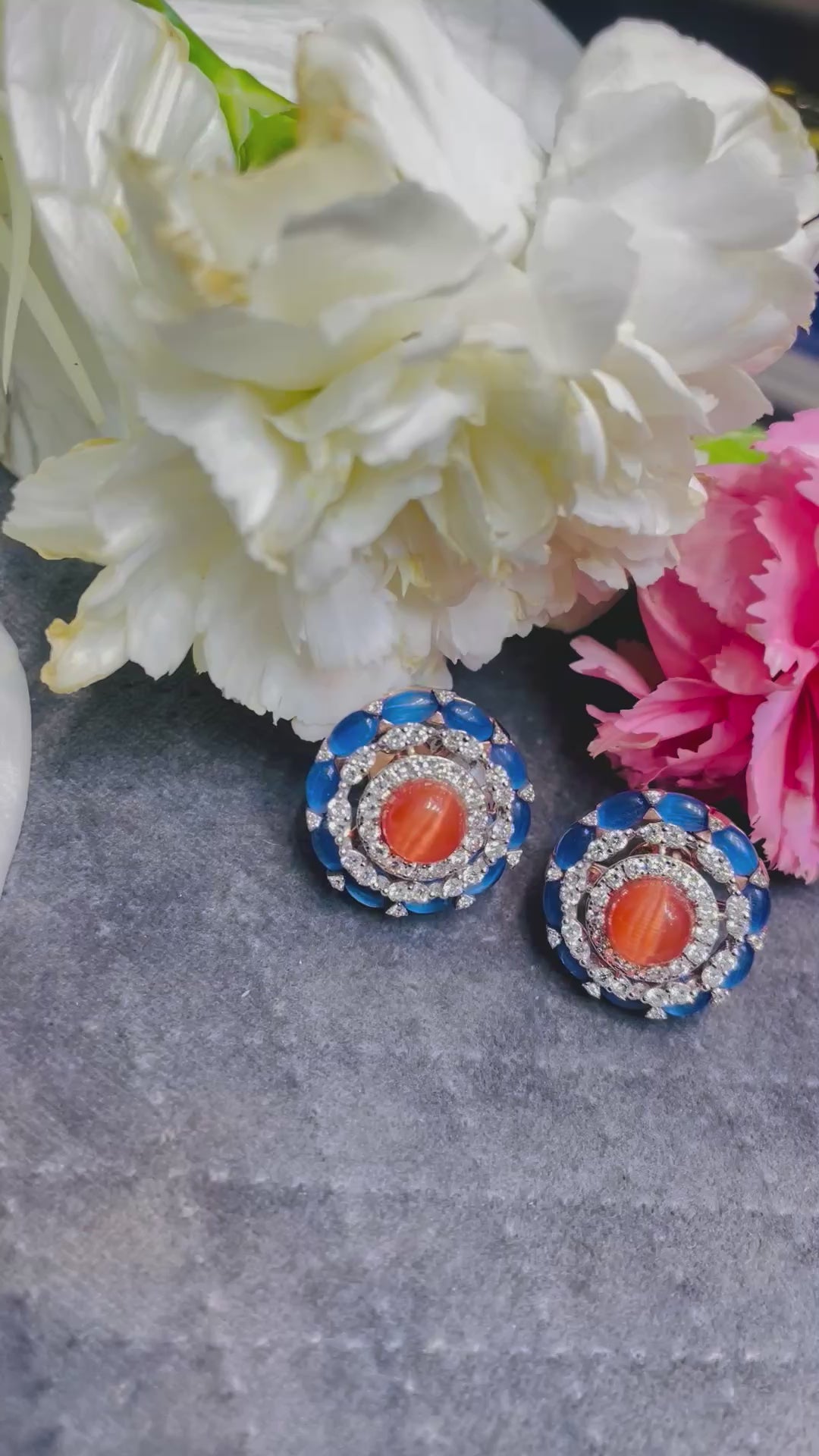 Unveil the perfect harmony of fiery orange cat’s eye gemstones, encircled by a sea of vivid blue enamel and shimmering diamonds. These exquisite statement studs are a celebration of artistry, colour, and charisma — designed for those who dare to stand out.