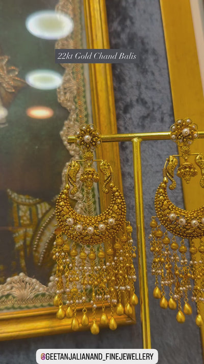 A majestic heritage-inspired Chandbali Jhumka crafted in antique gold finish, adorned with delicate pearls, intricate detailing, and cascading ghungroo drops. A perfect statement piece for weddings and festive occasions—rich, traditional, and timeless.