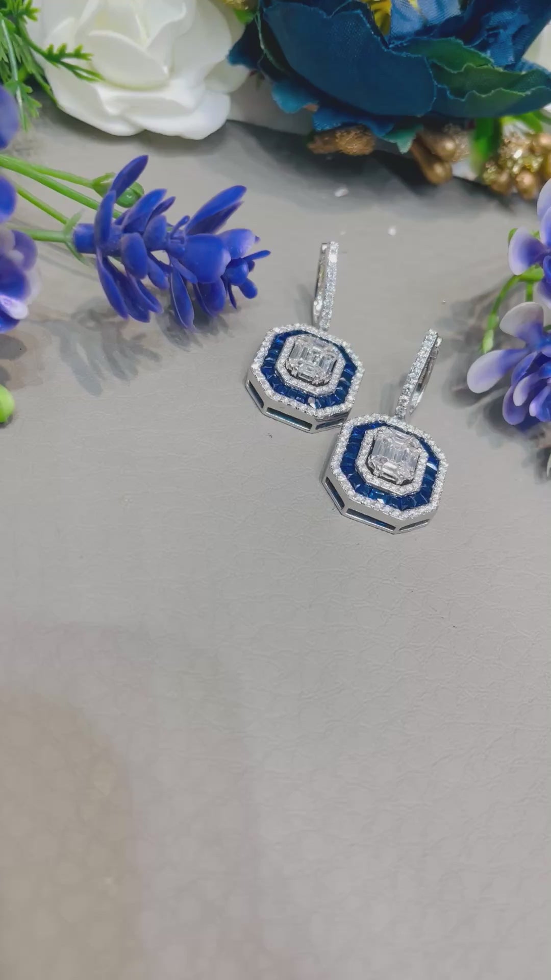 These elegant drop earrings feature a striking geometric design, with a central rectangular cluster of baguette-cut diamonds surrounded by a deep blue border and an outer halo of round brilliant-cut diamonds. The earrings are suspended from delicate hoops, creating a sense of movement and sophistication. The gold stand provides a neutral backdrop, allowing the intricate details of the earrings to shine. The soft, blurred background adds depth and focuses the viewer's attention on the jewelry.