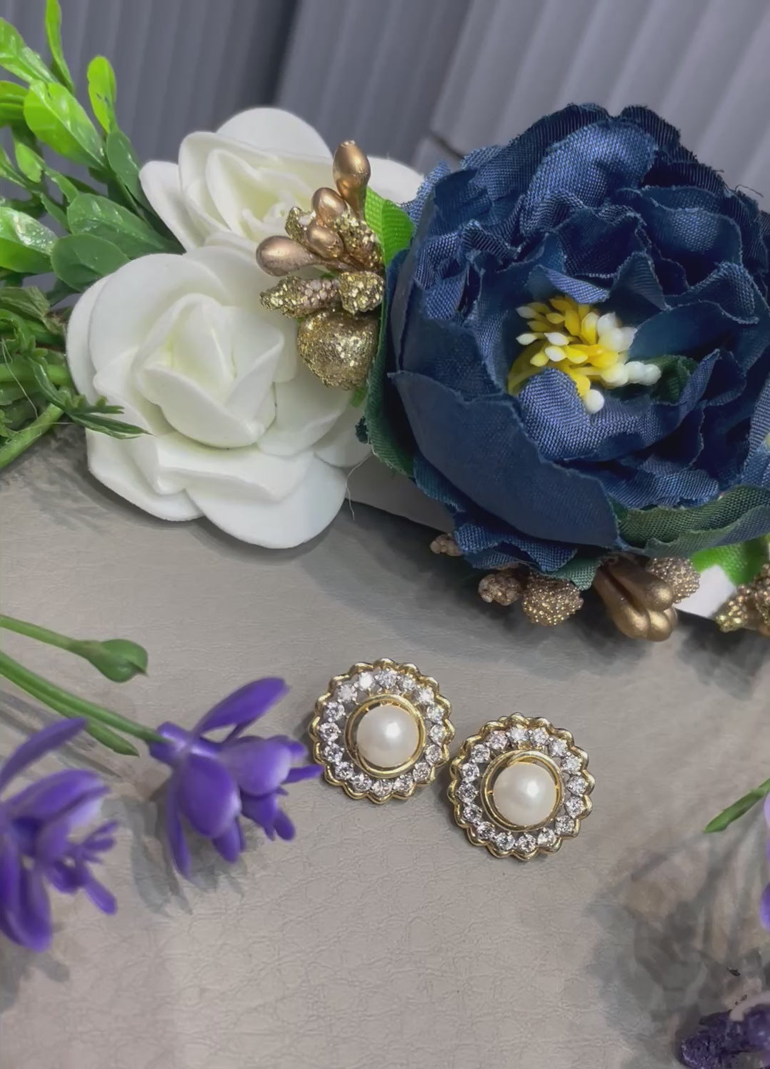 Set in a graceful gold-toned floral design, the classic pearls are surrounded by a sparkling halo of stones, creating a perfect balance of vintage sophistication and modern grace. Whether you’re dressing up for a wedding, festive celebration, or simply enhancing your everyday elegance — these earrings are a must-have in your jewelry collection.Perfect for gifting or treating yourself to a little luxury. Because pearls never go out of style. 🌸💫