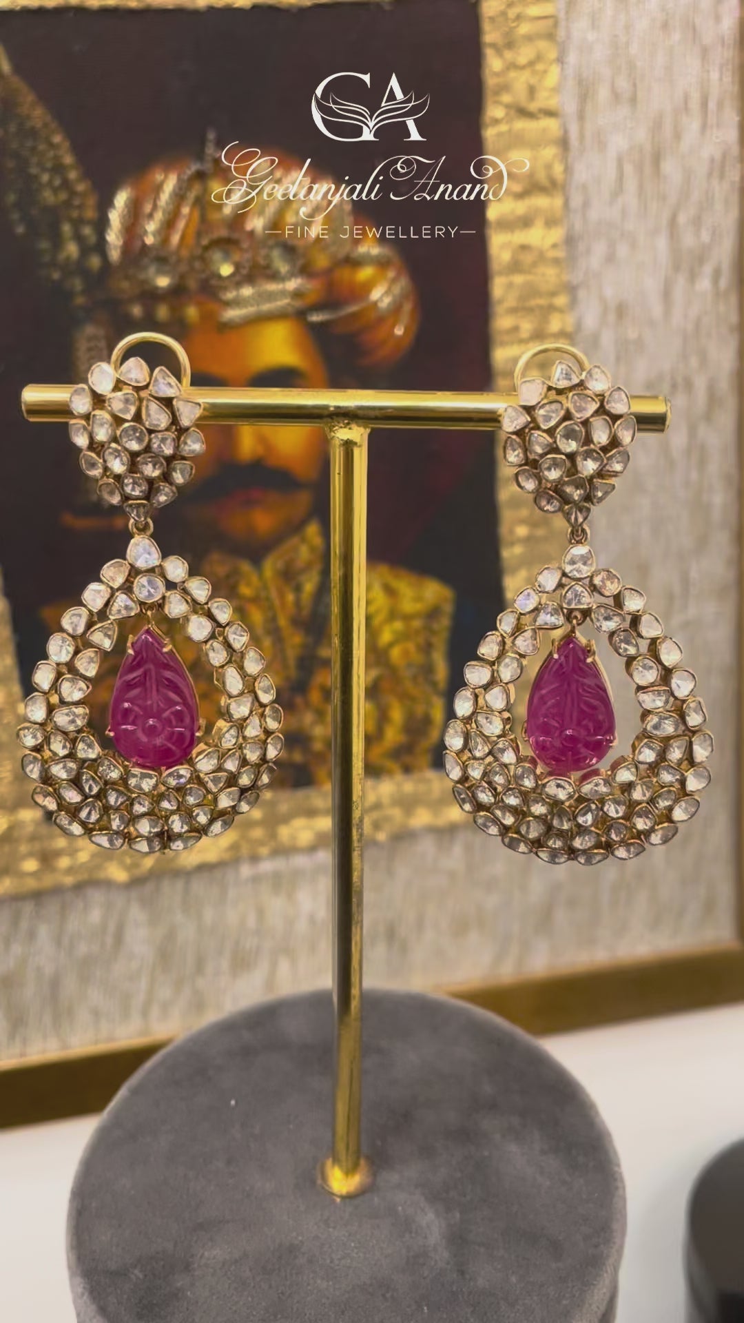 A breathtaking pair of handcrafted Polki earrings featuring an intricate double-layered open teardrop design. Each earring is studded with uncut Polki diamonds set in rich gold, creating a royal shimmer. At the center hangs a beautifully carved deep pink gemstone, adding a bold pop of colour and traditional charm. The floral Polki top further enhances the elegance, making these earrings a perfect blend of heritage artistry and timeless luxury — ideal for weddings, festive occasions, or statement looks.