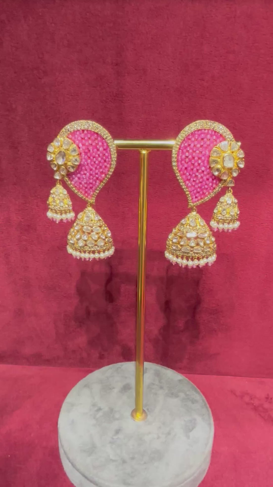 A stunning pair of handcrafted traditional jhumka earrings featuring vibrant pink stonework on an elegant teardrop-shaped base. The top is adorned with a floral Polki-style motif, adding a classic touch of sparkle. Each earring is completed with dual jhumka drops—intricately set with kundan stones and finished with delicate pearl edging. A perfect blend of bold colour and timeless craftsmanship, ideal for festive and bridal looks.
