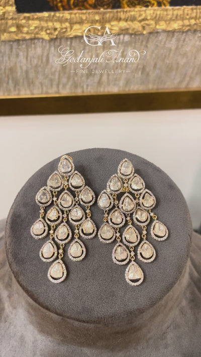 A masterpiece of traditional craftsmanship, these handcrafted Polki chandelier earrings feature multiple tiers of teardrop-shaped Polki diamonds, each framed with delicate detailing and set in fine gold. The cascading design adds graceful movement and an opulent sparkle, making them a perfect statement piece for weddings, festive celebrations, and grand occasions. Timeless, regal, and intricately designed—these earrings bring together heritage artistry and modern elegance in every shimmer